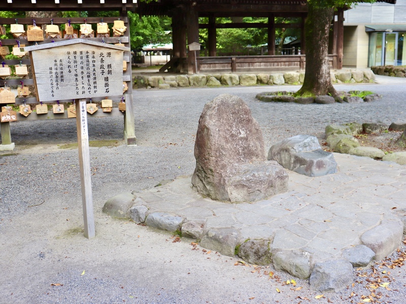 総門の前の参道脇には、頼朝と政子が腰かけたと伝わるそれぞれの「腰掛石」があります。