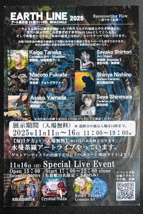 かつての人々は、今よりもずっと感覚が鋭く、自然や音、光といった世界の“流れ”と共鳴して生きていました。『EARTH LINE 2025』は、そんな原始の感覚を現代の空間に再び紡ぎ出すアート展。音楽・陶芸・書道・写真など6名のアーティストによる作品が交差し、人と地球、過去と未来をつなぐ表現が展開されます。