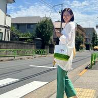 華やかに見えるカラーカーディガンを肩掛けすれば、重心が上がって細見えするうえに、サッと体温調整ができて便利ですよ♡