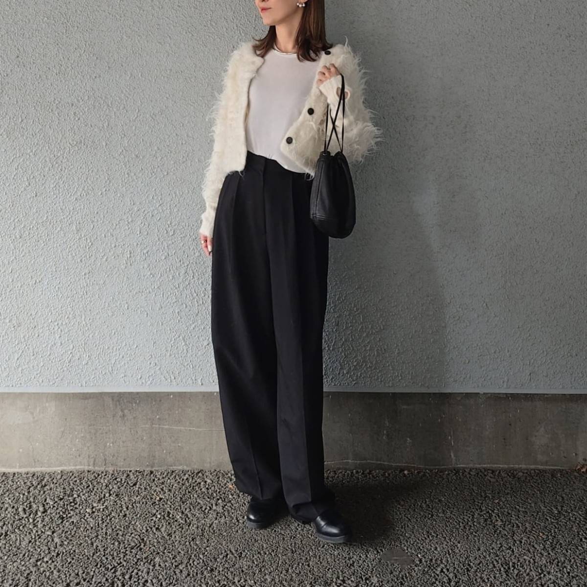 白カーディガン×黒パンツのモノトーンコーデは、細見え効果も◎