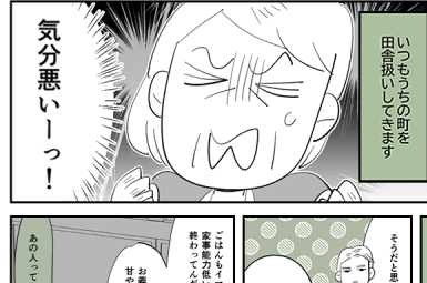 都会からきたお嫁さんは、今住んでいる町が田舎すぎて気に入らないのだそう。ずっと文句を言い続けられ、モヤモヤが止まらない義母さん。そんなある日……。