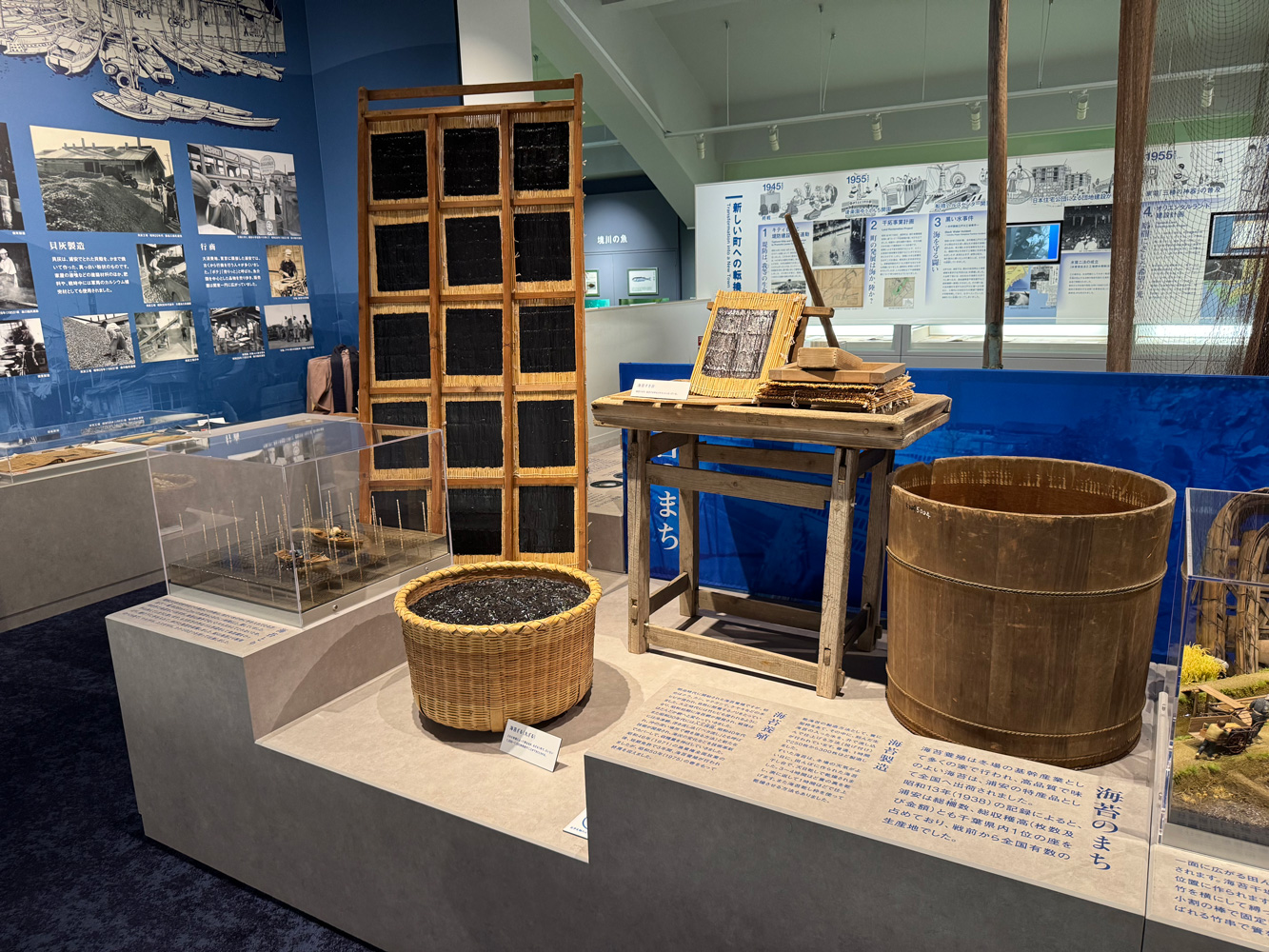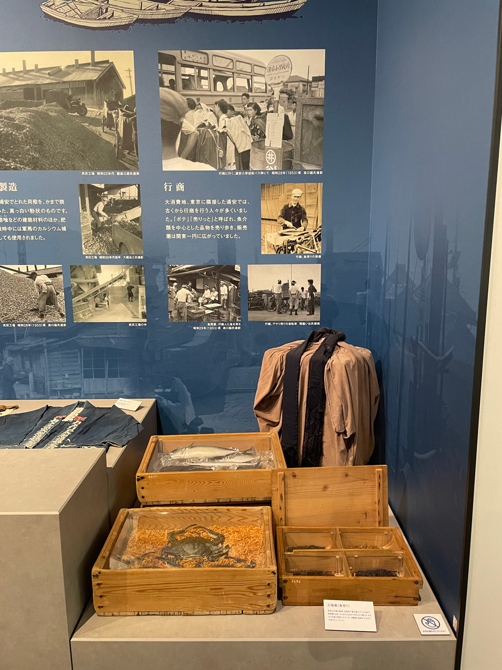 漁師町の歴史を紹介するテーマ展示室「海とともに」の「漁師町浦安」エリアでは、実際の道具や古文書なども展示されており、漁業、海苔養殖、貝加工など地域の生業について学ぶことができる。中でも驚いたのは魚の行商についてのパネルだ。