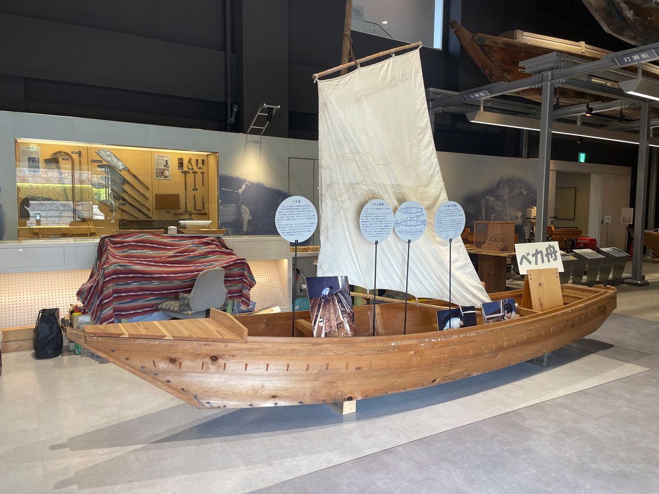 屋内にある船の展示室「海を駆ける」には、一人乗りの海苔採り用木造船「ベカ舟」が展示されている。『青べか物語』の「べか」とはこのベカ舟の「ベカ」だ。名前の由来については、舟を手で押すと「ペコペコ」なることから「ペコ」が訛り「ベカ」となったとか、「ぶっくれ船」という呼び名が縮まって「ベカ舟」になったなど、諸説あるようだ。1956~57年頃は海苔採り専用のベカ舟で1万円、貝採取も兼ねたベカ舟で2万3000〜6000円したと言われる(当時の大卒初任給は1万円程度)。