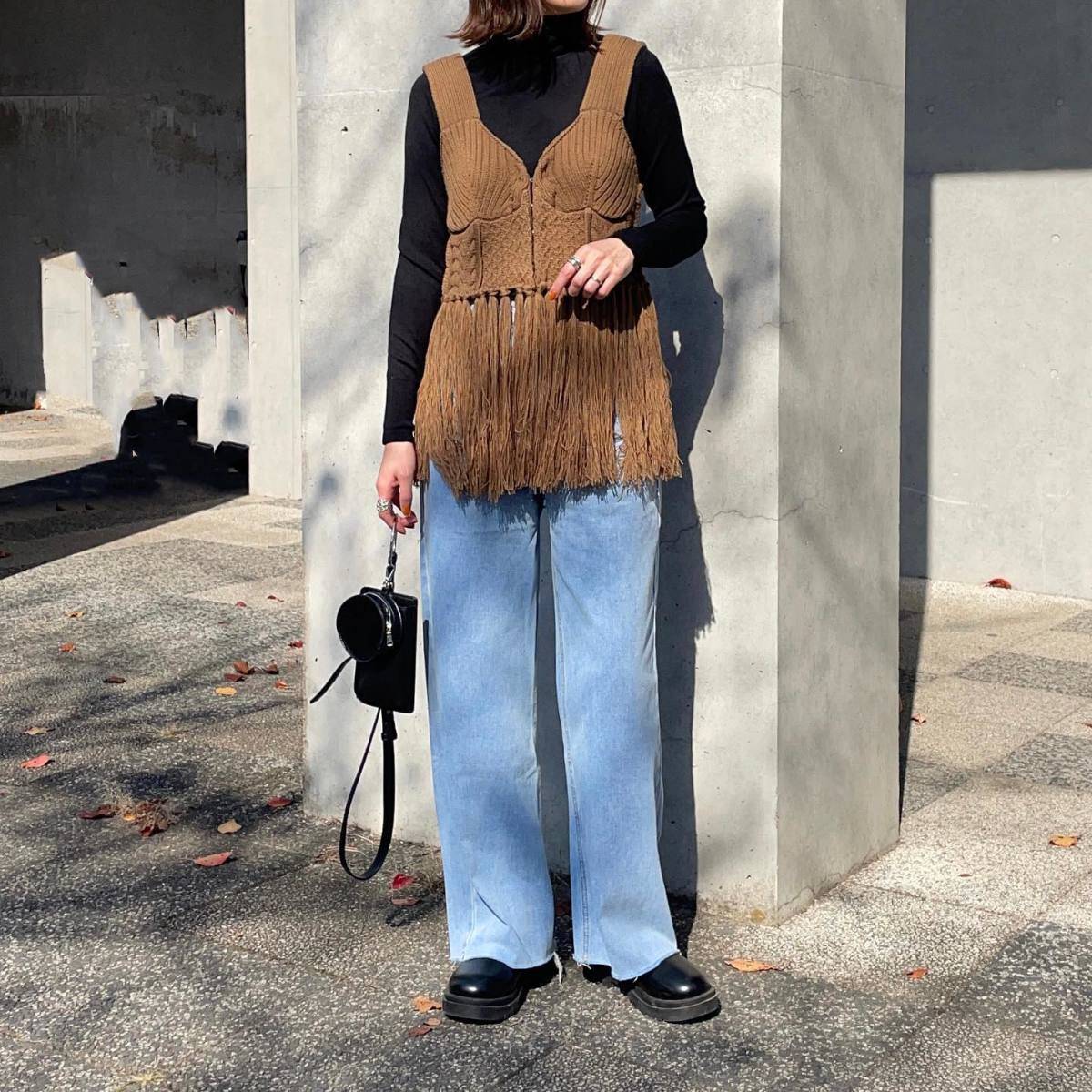 【11月編】センスいいデニムパンツコーデ②ハイネックニット×ビスチェの重ね着が◎