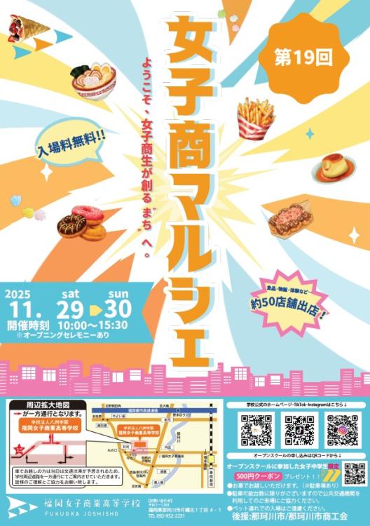 11月29日(土)、30日(日)は「福岡女子商業高等学校」の生徒たちが企画・交渉・運営する『第19回 女子商マルシェ』が開催!48店舗の個性豊かなお店が並びます。