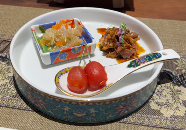 <前菜3種盛り合わせ>赤いのは、サクランボではなく、杏露酒に漬け込んだトマト。