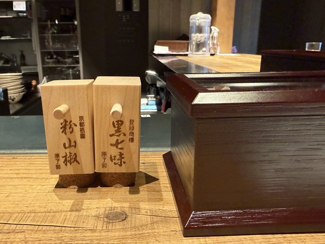 卓上には原了郭の黒七味と山椒も用意されており、お好みで風味を変えて楽しめます。