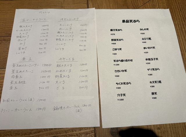 天ぷらは盛り合わせ、親子天ぷら、野菜天ぷらなどがあり、釜玉には明太子・バター・納豆といったトッピングも。