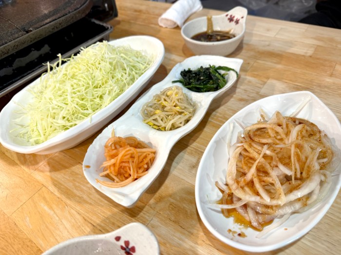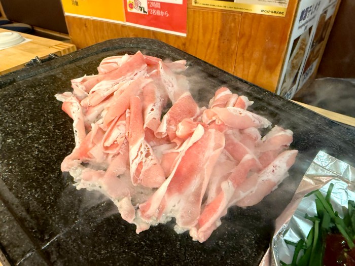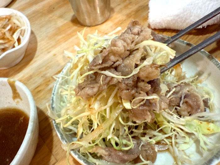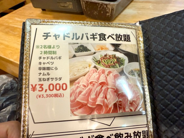 さて、私が「チャドルバギ食べ放題」を発見したのは新宿と大久保の境のエリアにある「豚かん」で、チャドルバギ食べ放題は2名様より。制限時間は2時間で、肉の他にキャベツ・辛味噌にら・ナムル・玉ねぎサラダが食べ放題に含まれるらしい。