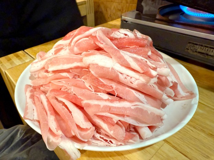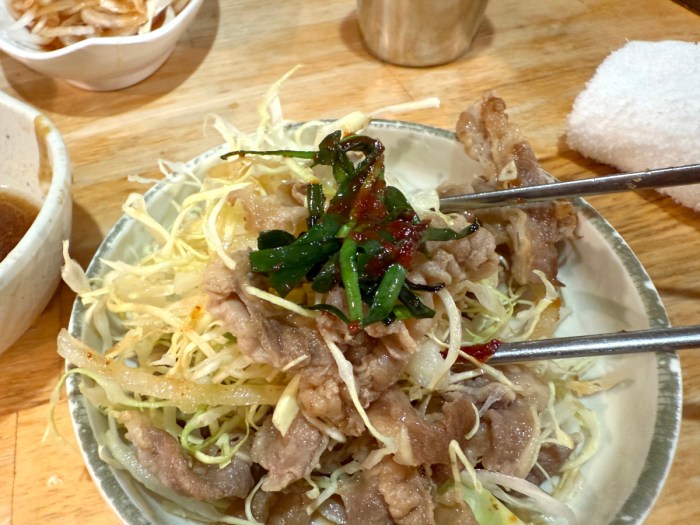さっそく食べてみると……はいウマい! 豚かんのチャドルバギはキャベツと一緒に食べるようで、さっぱりとしたタレとも相性は抜群。ニラもアクセントして最高だ。そのまま男2人でチャドルバギをグイグイ食べ進めていくと……