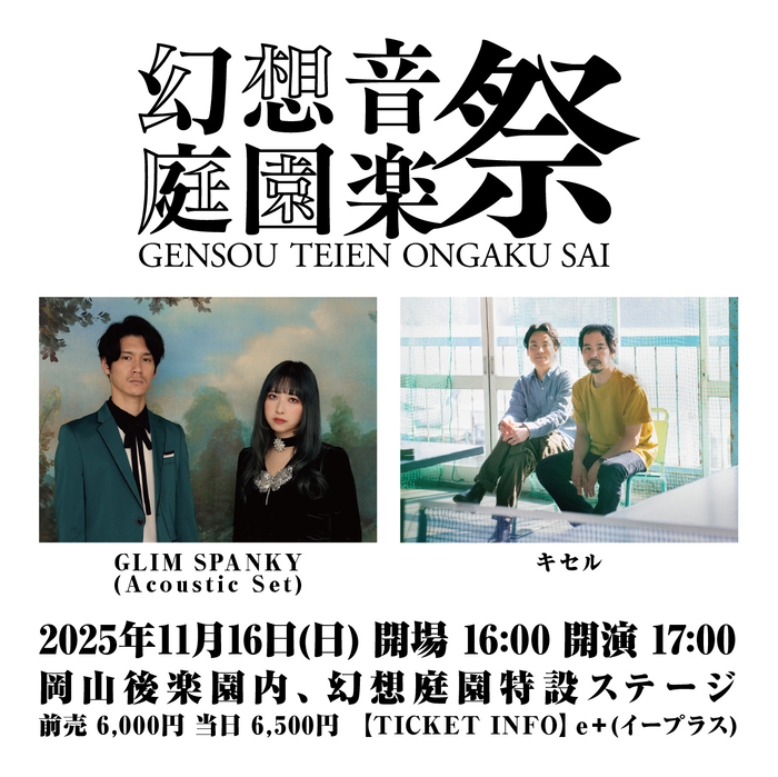 11月16日(日)、岡山県・後楽園内の幻想庭園特設ステージにて、音楽イベント『幻想庭園音楽祭』が開催される。出演はGLIM SPANKY、キセルの2組。
