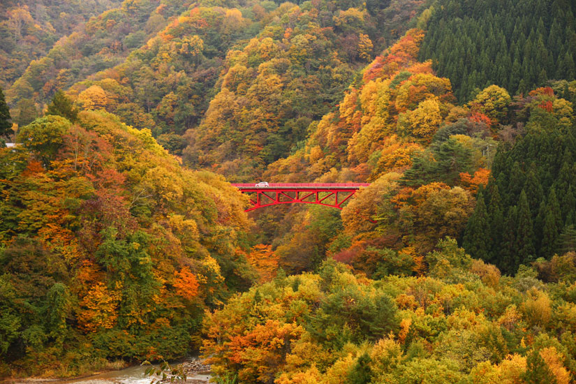 長野県長野県上高井郡高山村にある「松川渓谷」では、秋になるとモミジやカエデなどの木々が鮮やかに色づき、渓谷一帯が美しい紅葉に包まれます。なかでも「山田温泉 高井橋」は、松川渓谷の玄関口に位置するシンボル的な存在。深い渓谷に架かる赤い橋が色とりどりの紅葉に映え、渓谷の美しさを一層引き立てます。紅葉シーズンには、赤い橋と錦色の木々が織りなす絶景が訪れる人々を魅了します。
