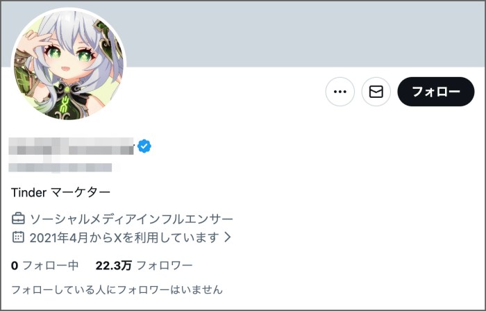 名前は「Tinder マーケター」。フォロワーは22.3万もいるけれど、な〜んか怪しい。乗っ取られたアカウントなのでは?