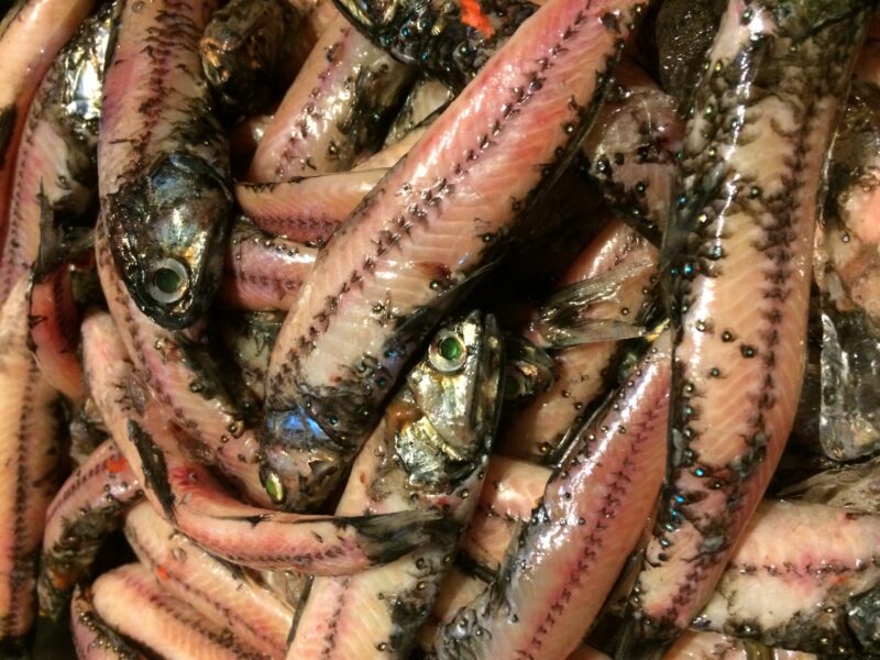 ハダカイワシという名前の由来は、鱗が剥がれやすく、水揚げされた時には鱗が取れているからと言われています。また、鱗が剥がれやすいことに加え、多くの種で発光器を備えていることも大きな特徴です。