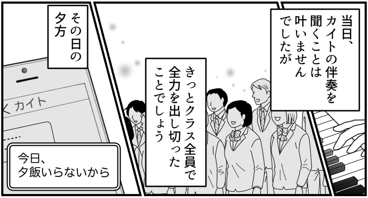 私は夫と高校2年生の息子・カイトと3人で暮らしています。カイトは子どもの頃からピアノを習っていました。中学で辞めてしまいましたが、なかなかの腕前です。そして学校行事の合唱コンクールで、カイトはピアノの伴奏をすることになりました。誰もやりたがらないので仕方なく引き受けたそうですが、きっと本番はクラス全員で全力を出し切ったことでしょう。そして夕方になり、カイトからは「今日、夕飯いらないから」という連絡が来ました。