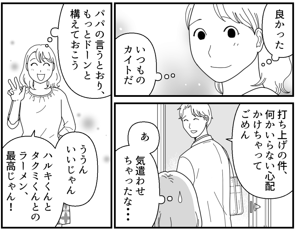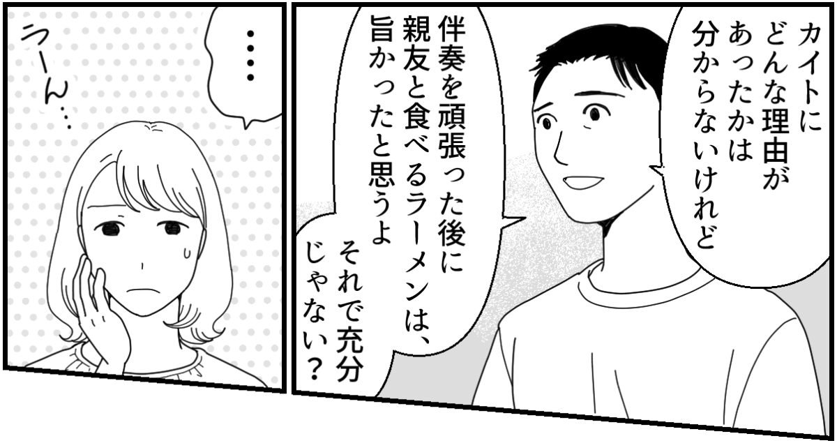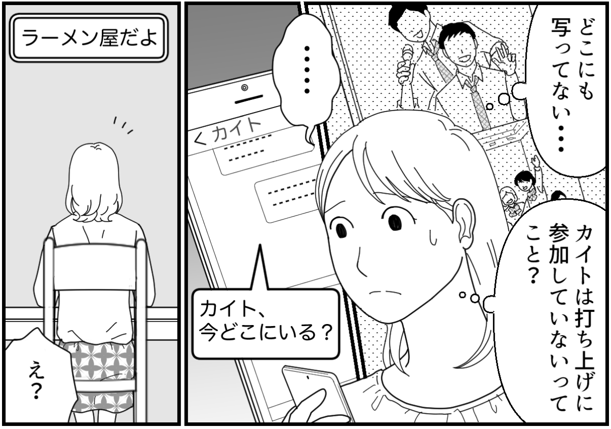 打ち上げの写真にカイトの姿が見つからなかったときは、カイトがひとりで打ち上げに行かない選択をしたのかと思って心配になりました。けれど親友と一緒にラーメンを食べているようで、まずはひと安心です。 それにしても、カイトはクラスの子たちと上手くいっていないのでしょうか。もしこういうことが日常的にも行われているのだとしたら……。