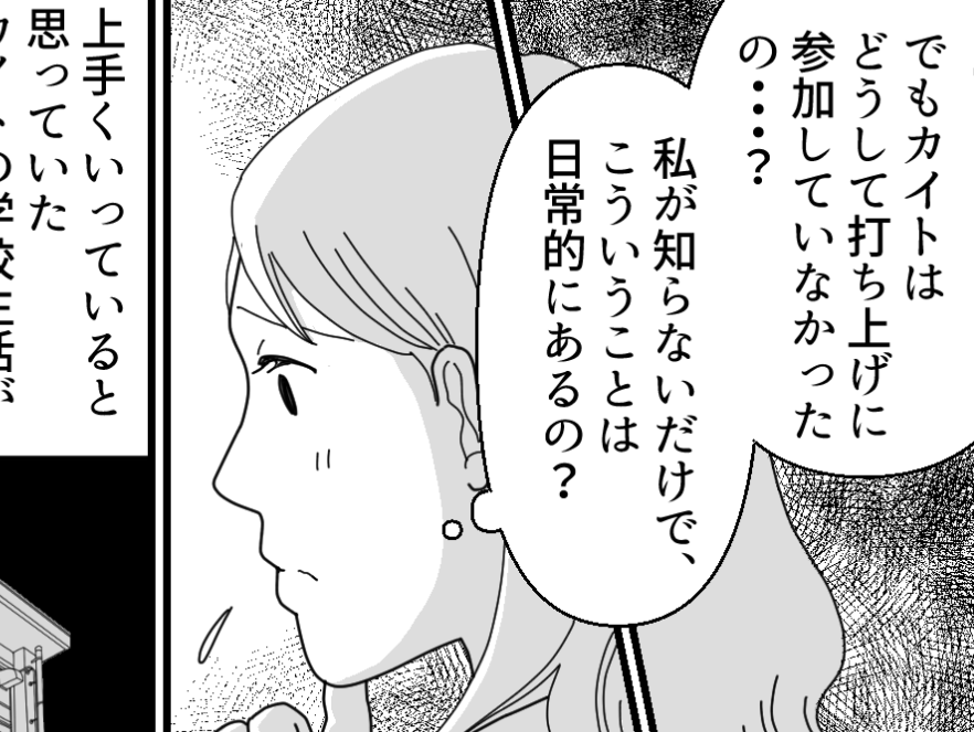 私は打ち上げにカイトが参加していないのに気づいて動揺してしまいました。けれど帰宅したカイトはいつもと変わらない様子。逆に「心配かけちゃってごめん」とまで言ってくれました。子どもに気遣わせてしまって申し訳ないかぎりです。夫の言うとおり、私はもっとドーンと構えているべきだったのでしょう。 子どもといっても高校生はもう半分大人のようなものかもしれません。カイト自身があまり気にしていないのであれば、私たち親も必要以上に踏み込むことはしないようにします。もしクラスにカイトのことを嫌う人がいても、カイトが心から信頼できる友人がいることの方が何倍も大切だと思ったのでした。