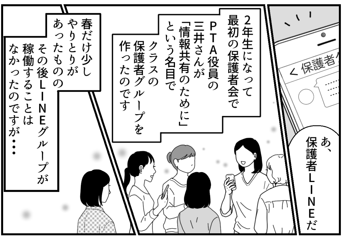 夫と2人で夕飯を食べていると、クラスの保護者LINEが入りました。2年生になって最初の保護者会で、PTA役員の三井さんが声をかけて作ったものです。最初だけ少しやりとりがあったものの、その後は動いていなかったのですが……。