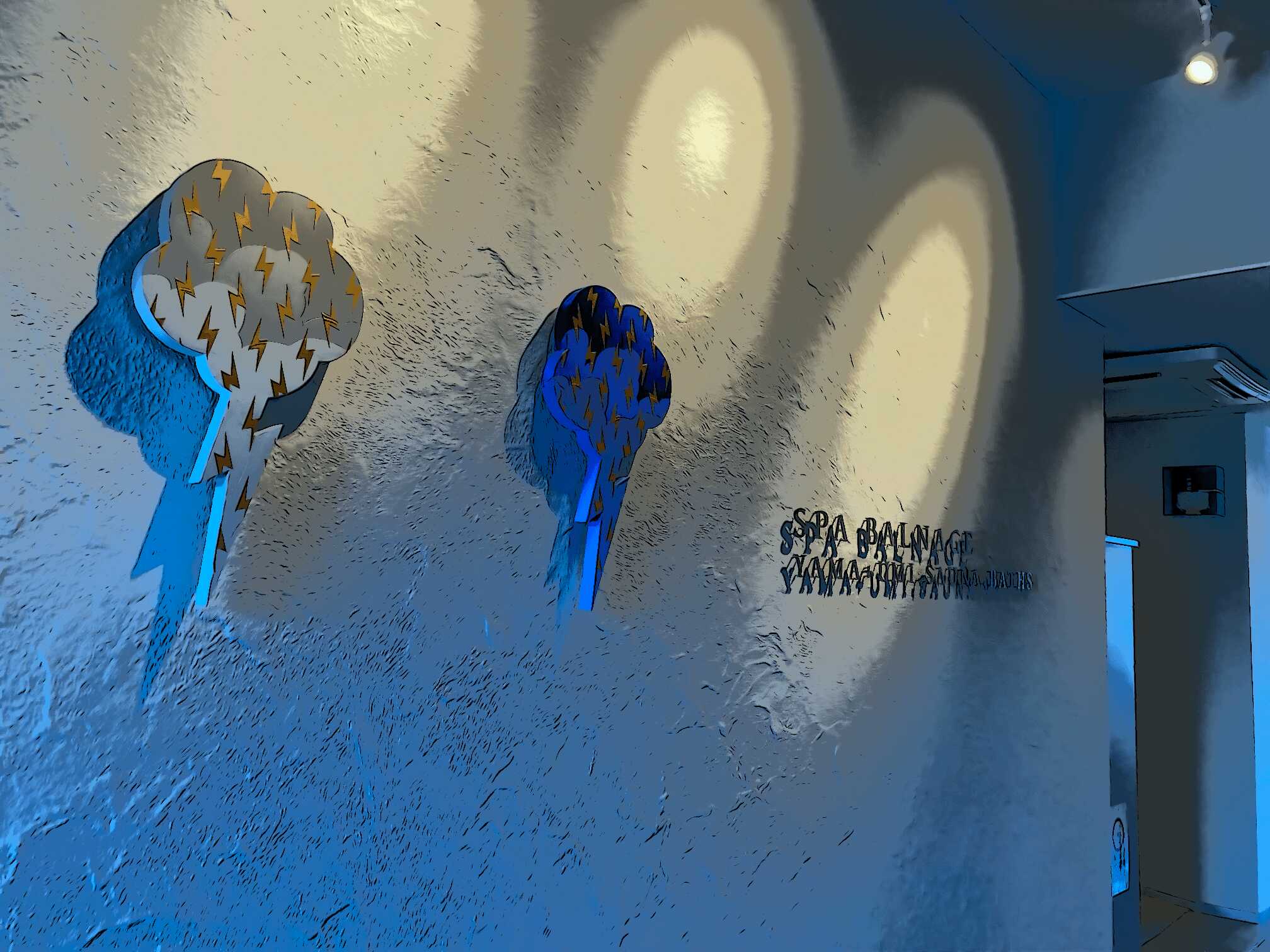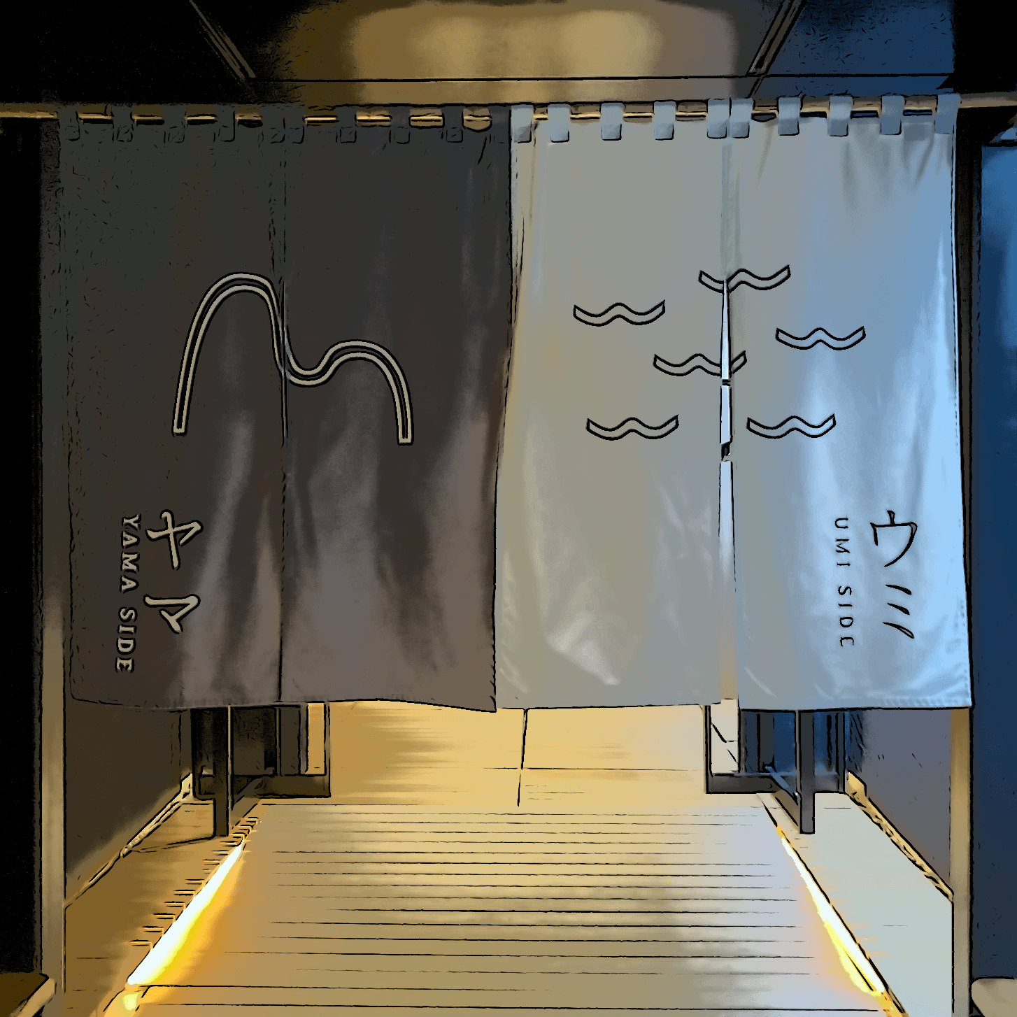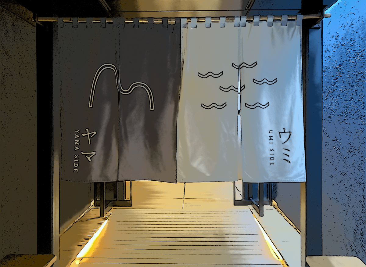 1階のフロントで祝日の日帰り入浴料2800円を支払い、フェイスタオルとバスタオルを受け取ってエレベーターで上がると、アーティスティックなシンボルが出迎えてくれた。2024年4月のオープンから1年ちょっと経ったが、施設は全体的にまだまだ真新しい空気感がある。洗練されたデザインの暖簾をくぐり、この日男湯に設定された「ウミ」エリアに入ると、客は自分ひとりだけだった。