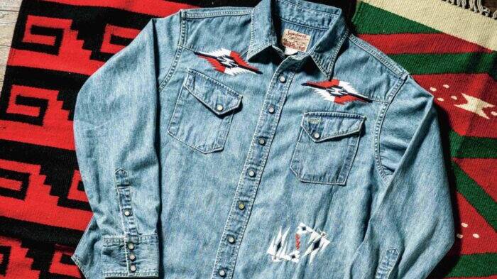 そしてこのブラウスに“ウエスタン”を感じる最大の特徴は、ポケットに施された革の補強だ。ワークウエアの生地の補強のためのディテールとしてリベットが有名だが、ジーンズの元祖・リーバイス社が金属リベットの特許を取得したのが1873年5月20日。その1年後、1874年8月25日に革によってストレスポイントを補強する特許を取得したのが「グリーンバウムブラザーズ」であった。小さな面積ではあるものの、このレザーの放つ存在感や、ウエスタンとの結びつきの強いインディアン特有のネイティブ柄に多くみられる三角の形状から、“ウエスタンらしさ”が多分に感じられる。
