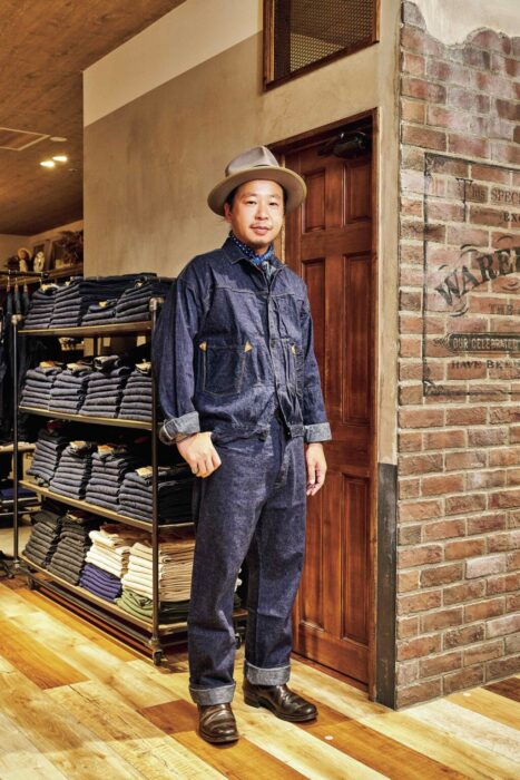 したがって、コーディネイトに取り入れる際もウエスタンを意識するとうまく纏まる。ブラウスと同生地のパンツを着用し、ハットや首に巻いたバンダナ、ブーツを合わせた坂本さんの装いがその好例だ。「ウエスタンウエアも広い意味ではワークウエアのひとつ。そこまで難しく考えずにいつものワークスタイルのような感覚で組んでいます。しかし、このブラウスとジーンズを普通に着ると、ただのデニムのセットアップになってしまいます。そこで、小物選びが重要なんです。被っているのはウエスタンハットではないですし、ブーツもエンジニアです。必ずしも本物のウエスタンアイテムではなくても、合わせ方やアイテム選びによって、現代的なウエスタンスタイルをイメージしています」