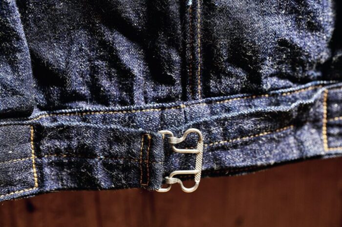 背面には鉄製のバックルバックが付く。生地はタテ糸に7.5番手×ヨコ糸に16番手の糸を使用したセルビッチライトオンスデニムを採用。