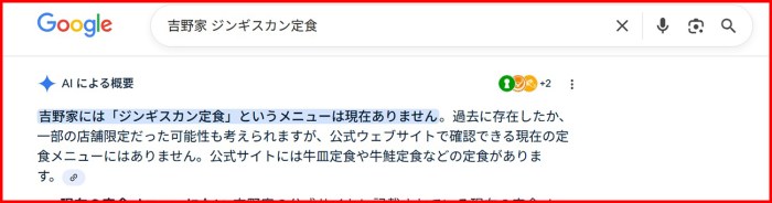試しにGoogleで吉野家のジンギスカン定食を調べてみたところ、AIは「吉野家には『ジンギスカン定食』というメニューは現在ありません」との回答だった。少なくともAIよりは早く見つけられたようである。