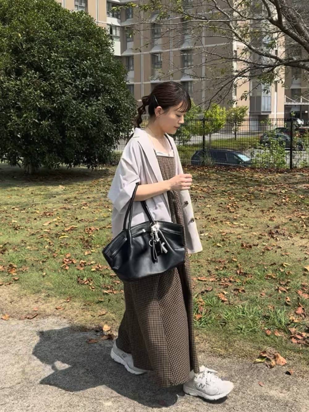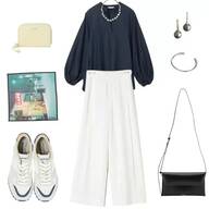 バッグはベージュ、靴は白と、お洋服と同色の小物を合わせると統一感が出るので、参考にしてくださいね。