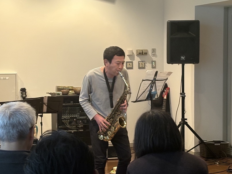 静岡市出身のフリージャズ系アルトサックス奏者の望月治孝さんの、悲鳴と旋律が交接するようなフリーキーかつ叙情的な演奏に続き、工藤さんが登場。マヘル・シャラル・ハシュ・バズ名義で活動するバンドは演奏ごとにメンバーが違うようだが、この日は静岡県内のミュージシャンを交えた9人編成だった。