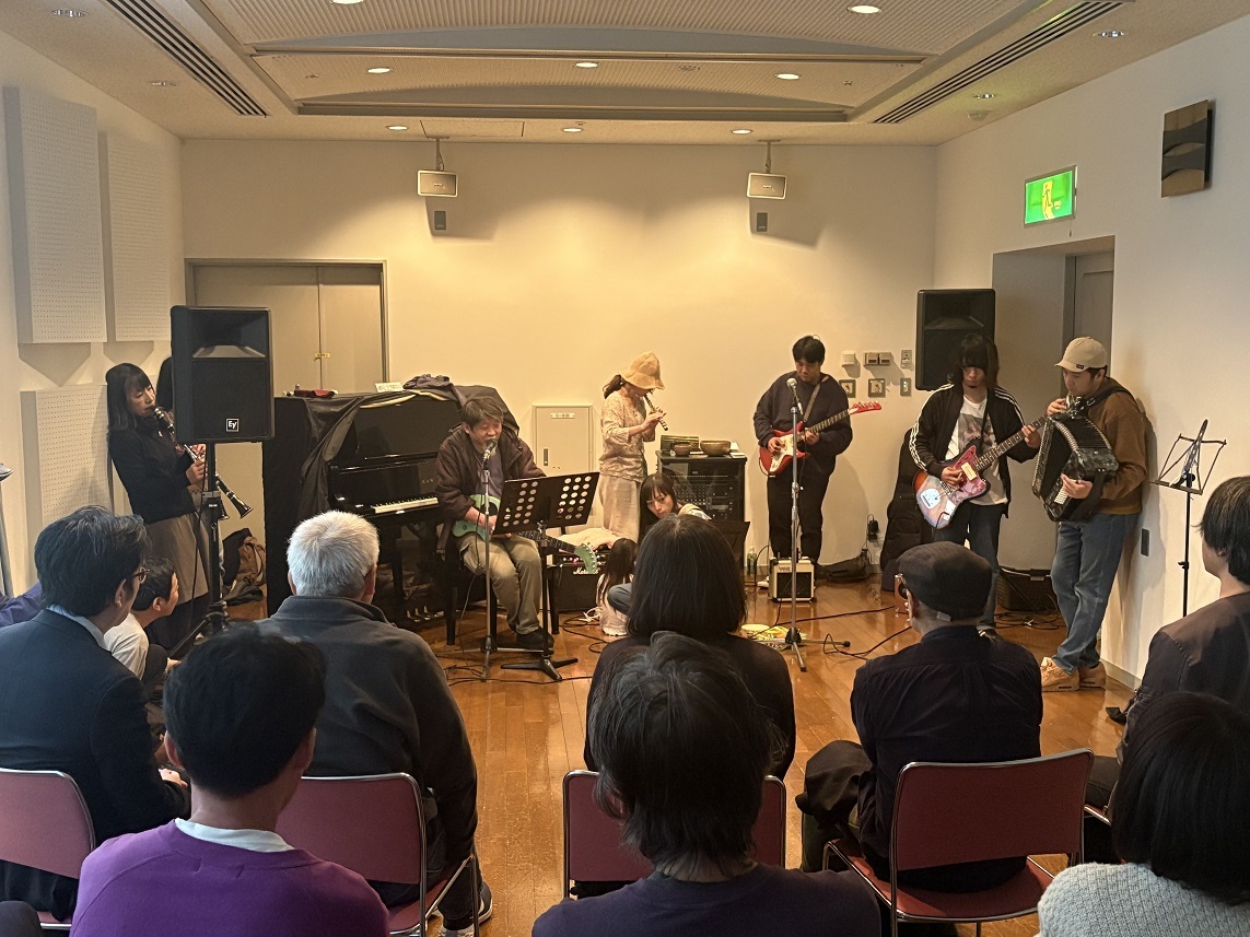木管楽器3、ギター2、ベース、アコーディオンをバックに、ボディーにスピーカーが付いたいわゆる「ゾウさんギター」を膝に乗せた工藤さんが次々に自作詩を朗読する。時折、客席の女性メンバーがコルネットで乾いた破裂音を響かせる。詩は全て、浜風文庫で発表した作品。1時間の演奏で80編ほど披露しただろうか。