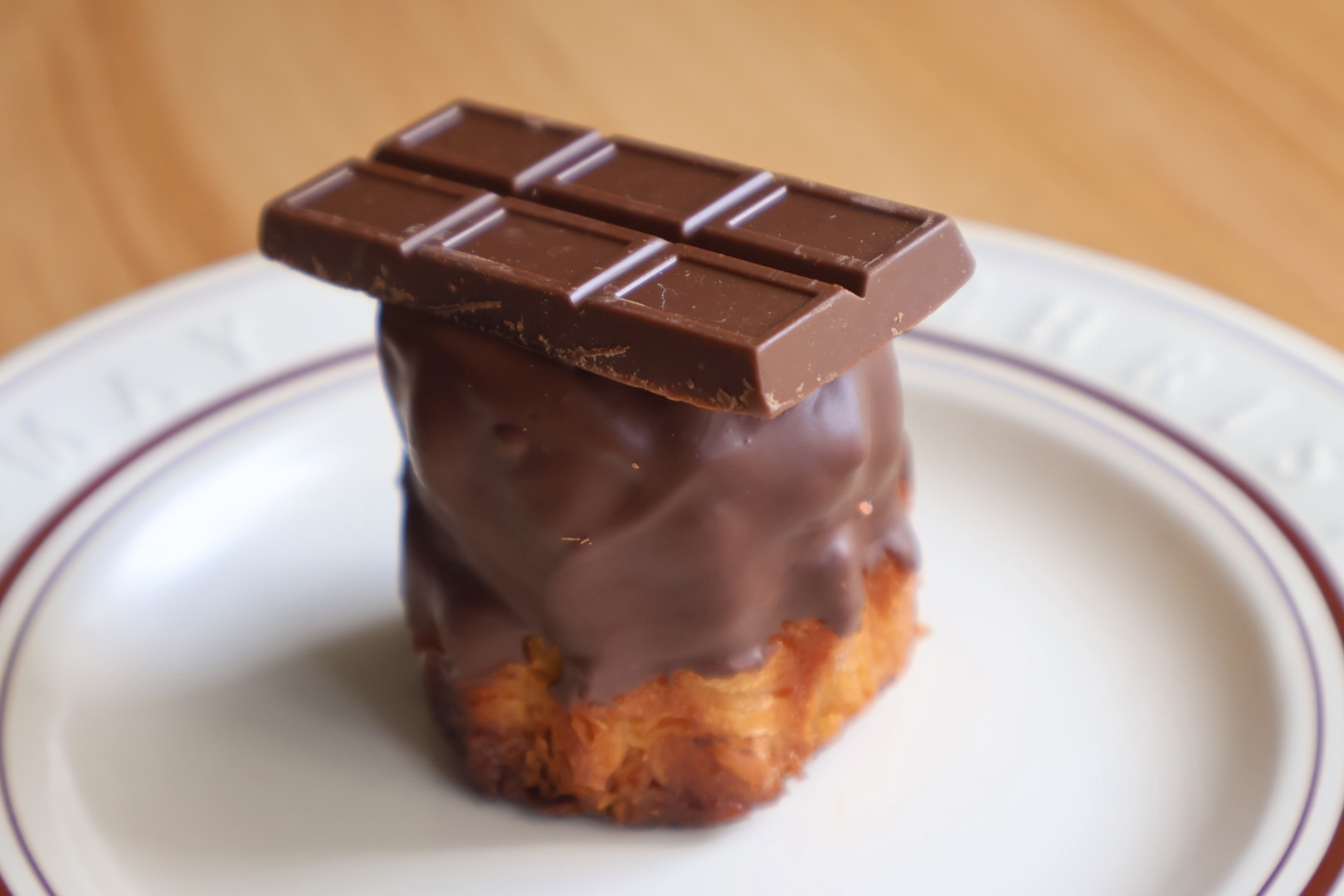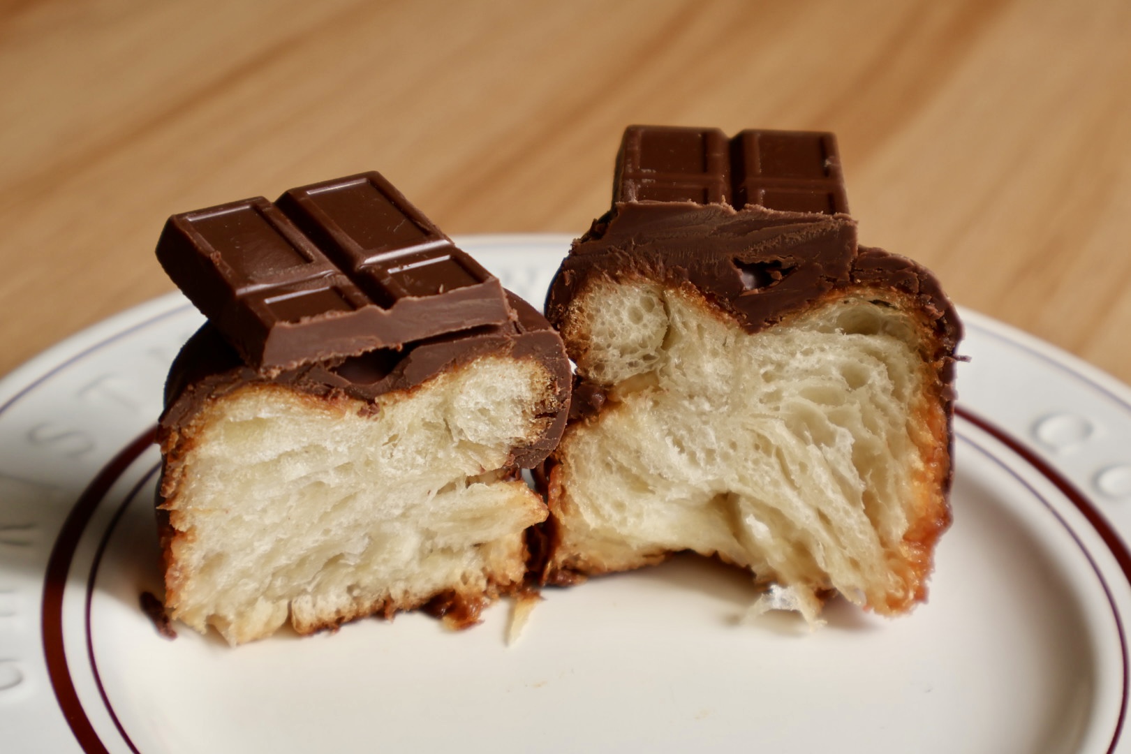 カヌレとクロワッサンの融合のアイデアに思わず購入!たっぷりかかったチョコとデニッシュ生地が相性最高◎
