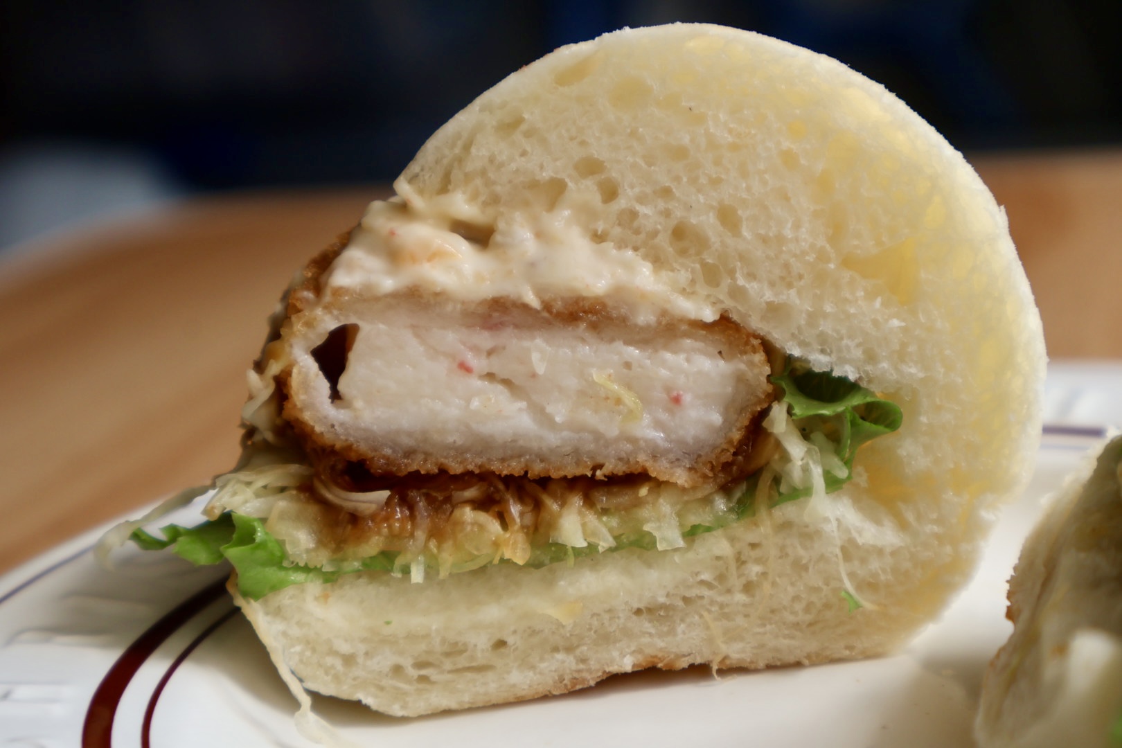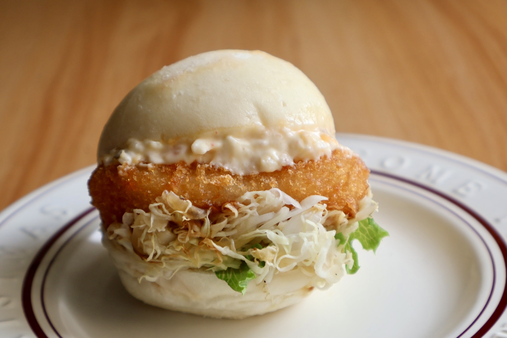 白パンの間には、タルタルソース、グラコロ、千切りキャベツ、レタスが挟まっていました!パンはふわっとしていて、中のグラコロが引き立つシンプルな味わい。