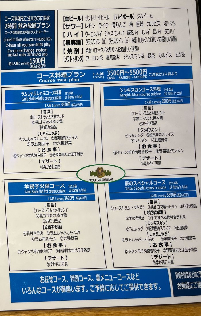 ほかにも、2名〜の注文で、羊肉のしゃぶしゃぶセット(1人前1410円)やジンギスカンセット(1人前1410円)、コース料理のプラン(1人前3850円〜6050円)も用意されている。