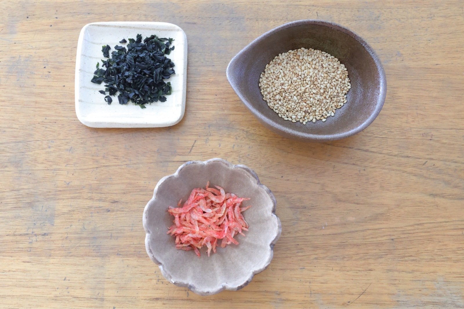 おにぎりの具材に使う乾物は、「乾燥わかめ(ふりかけタイプ)」、「小エビ」、「白ごま」です。旨味と栄養がぎゅっと詰まったおにぎり、さっそく作っていきましょう。