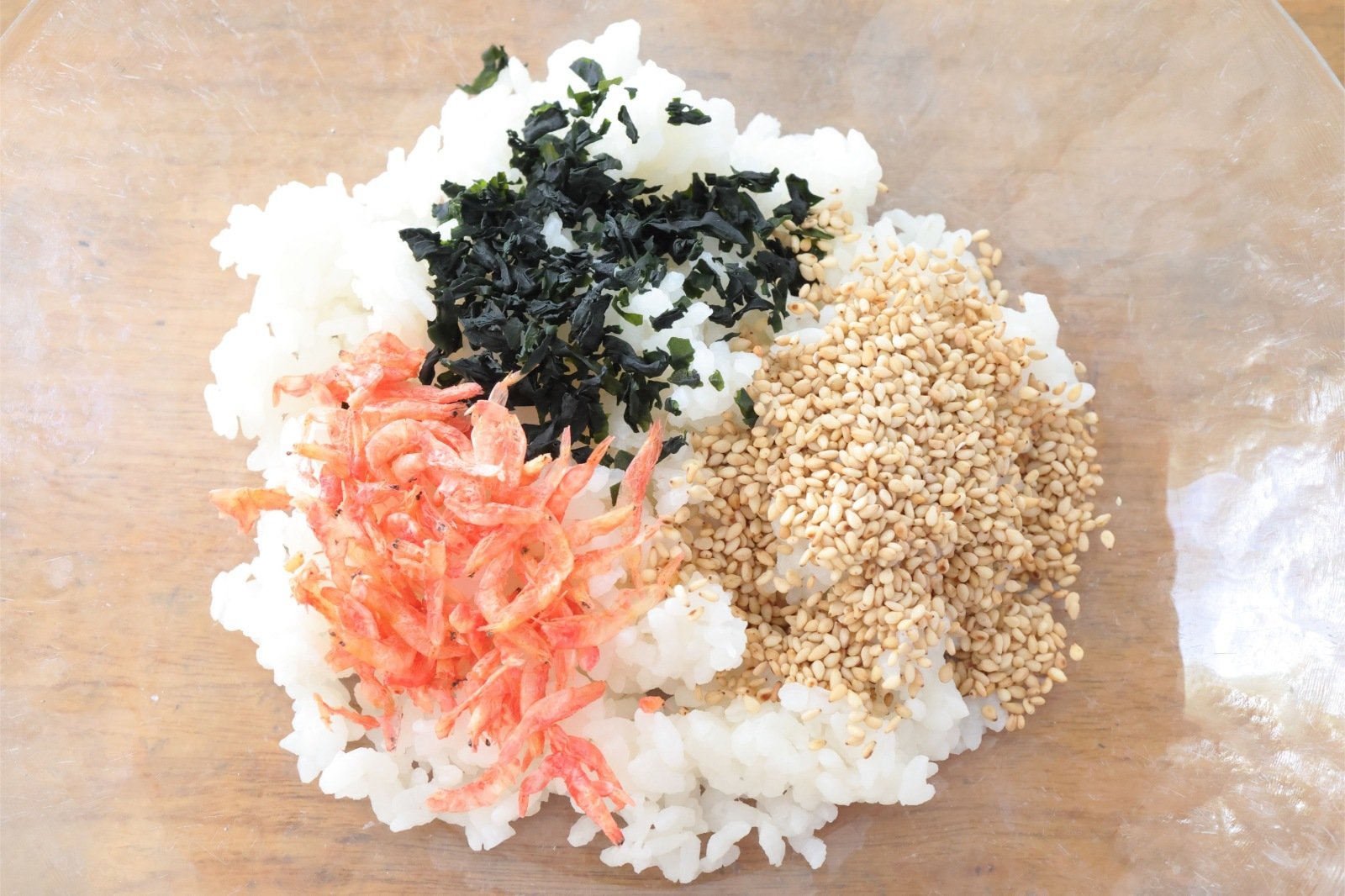 1.ごはんに、乾燥わかめ、小エビ、白ごまを混ぜ合わせます。