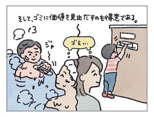 そして、子どもはゴミに価値を見出すのも得意。化粧水の包装に使われていたプラスチックのケースを持ってお風呂に入り、お湯を入れて遊んだり。ポストに入っていたチラシを、なんどもポストに入れては出して遊んだり。こちらが完全にゴミと思っているものを楽しんでいる様子を見ると、とてもかわいい。