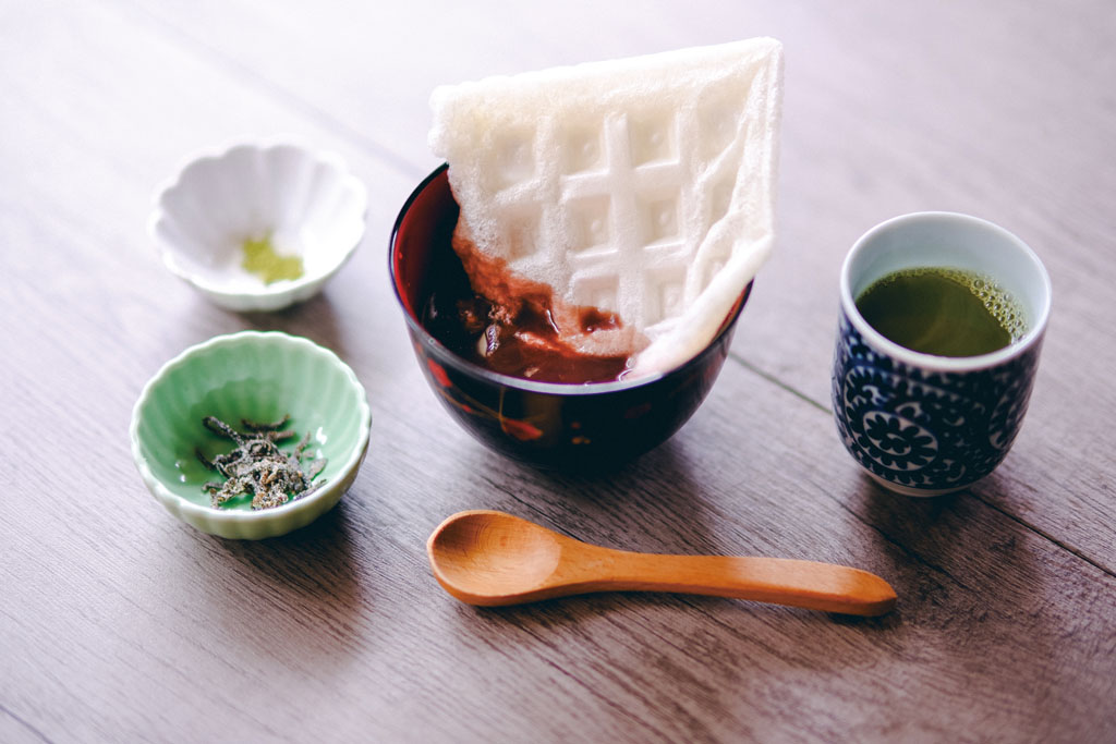 モッフルぜんざい600円。ほか、パフェもスタンバイ。気軽にスイーツのみのオーダーOK。