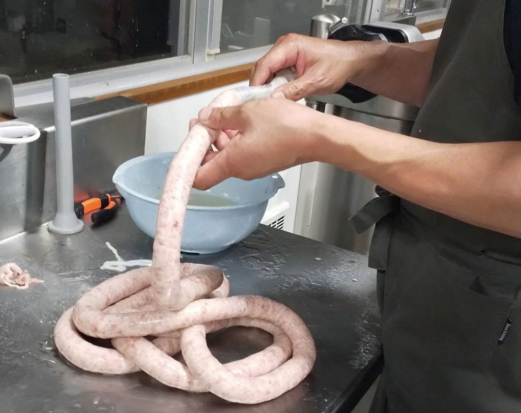 フランクフルターブルストは、ドイツの農村に根付く伝統的な作り方を再現している。店に併設したスモークハウスでハムやベーコンもときどき作る。