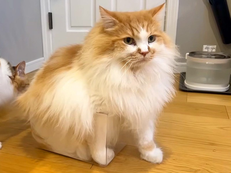 うなぎちゃんが「入れなくにゃい…?」といった表情で見守る中、ぽてちちゃんは虫かごの中へ。ただ、やはりうなぎちゃんや飼い主さんの予想通り、体のサイズと合っておらず、とても窮屈そうに入っていたといいます。あまりにも強引なぽてちちゃんの入り方に、思わず笑ってしまいました。