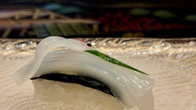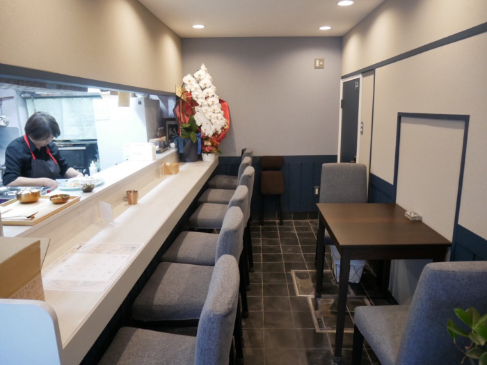 店内はカウンターが6席ほど、2名掛けのテーブルがひとつ。こぢんまりとした空間ながら、真っ白なカウンターが印象的で、清潔感と上質さを感じさせます。