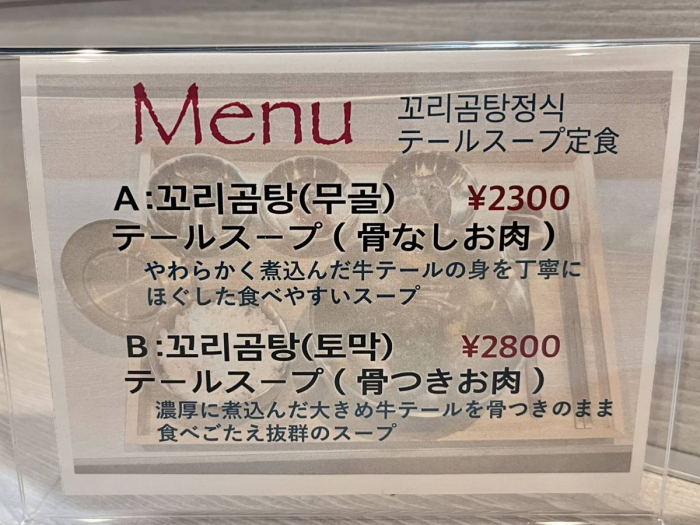 同店のランチメニューはとてもシンプル。基本は「テールスープ定食」一種類で、骨付きか骨なしのお肉を選ぶスタイルです。