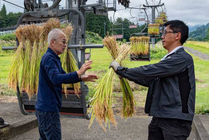 新潟県妙高市両善寺のロッテアライリゾートで2025年9月25日、スキーリフトを使った稲の天日干しが始まった。稲は地元住民と連携し同施設のロッテアライ農場で栽培したブランドコシヒカリ「星空米」で、10月のイベントで販売する。