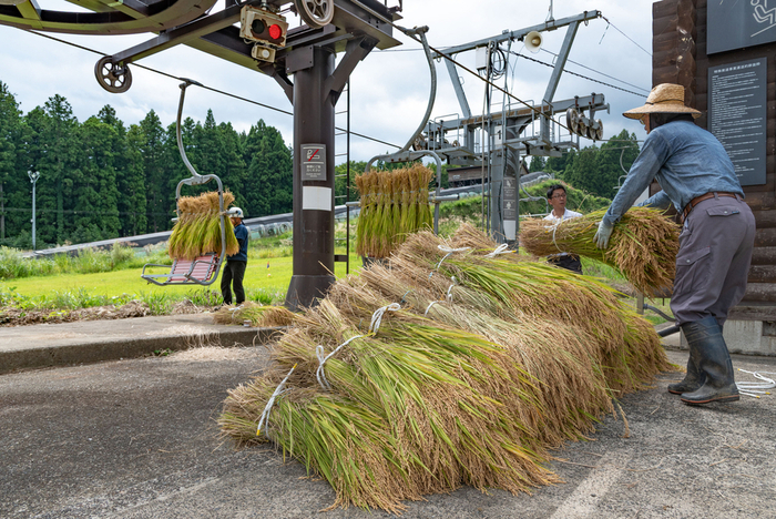 この日は朝から従業員や小島事務局長など4人が、一部の稲刈りを実施。稲束約40束をゲレンデに運び、片道約400mのリフトに架けた。2週間ほど天日干しするという。