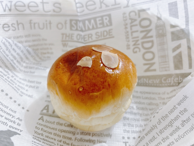 まずは、お店で人気No.1の『くりーむパン』(152円)。小ぶりなパンのてっぺんに乗ったアーモンドスライスがかわいらしい一品です。ふんわりとしたパンの中には、まるで生クリームのように軽くてなめらかな自家製カスタードがぎっしり! 甘さ控えめの優しい味わいで、いくつでもいただけてしまいそうです。