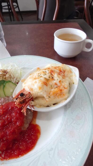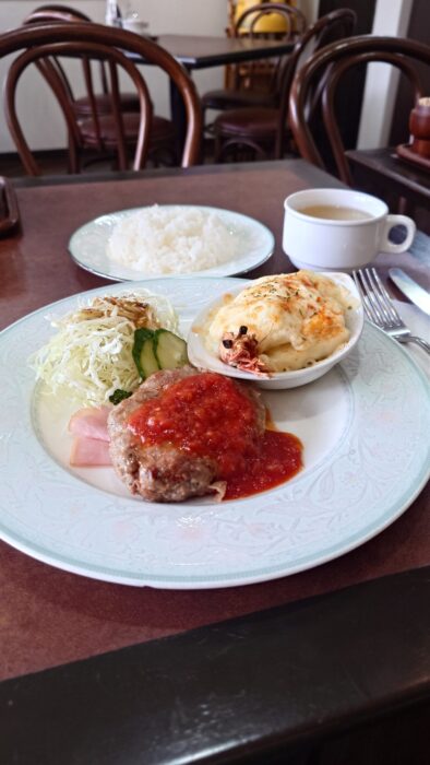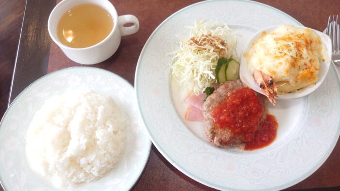 ボエームランチには、ハンバーグ・グラタン・サラダ・スープが付いています。ライスかパンを選ぶことができます。
