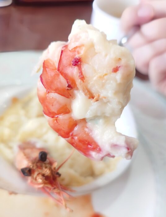 運ばれてきた瞬間、エビの香ばしい香りがしました。食欲をそそります。グラタンには、エビの頭が入っていますね。
