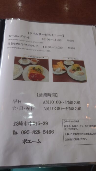 ボエームでは、ランチだけでなく、モーニングから洋食の定番メニュー、アルコールまで幅広く揃えています。