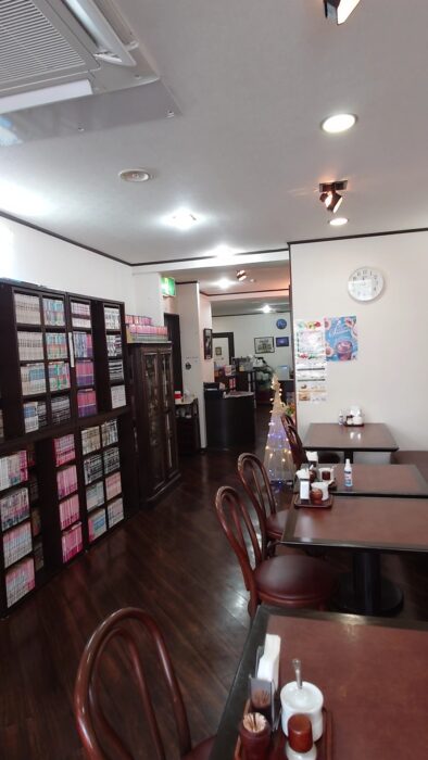 今回は、入店してすぐ右手側に案内されました。画像は、右手側の座席から入り口方向を見ています。漫画なども置いてあります。