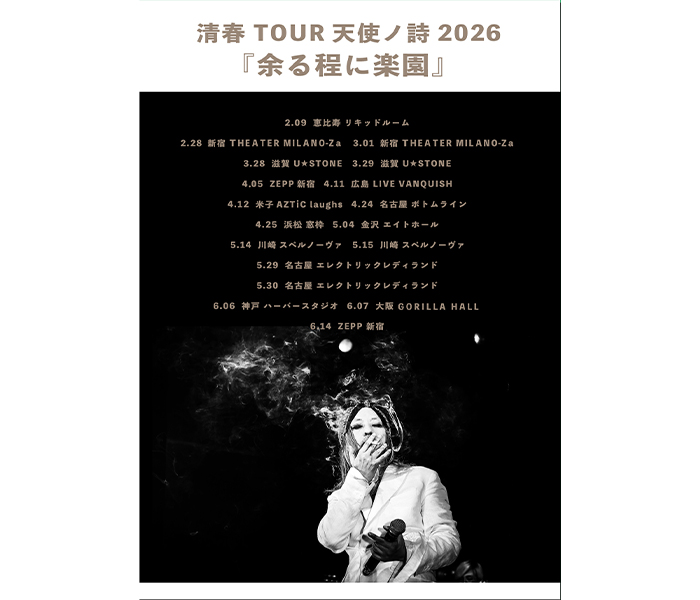 デビュー30周年記念での黒夢再始動と並行して、昨年から今年にかけては約100公演というツアーを行う清春が2026年の新たなツアー『余る程に楽園』を発表した。