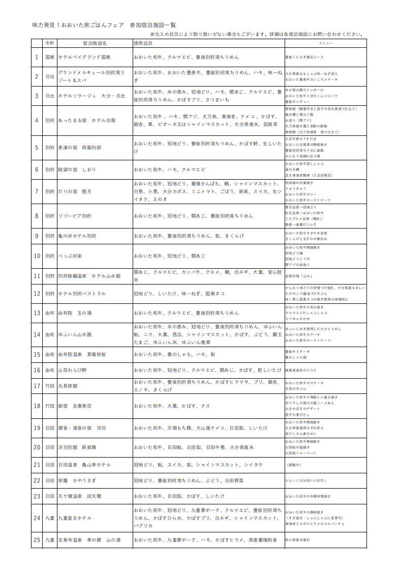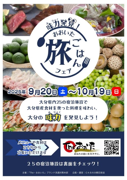 大分県内25の宿泊施設で大分県産食材を使った料理が味わえる『味力発見!おおいた旅ごはんフェア』が開催中です。